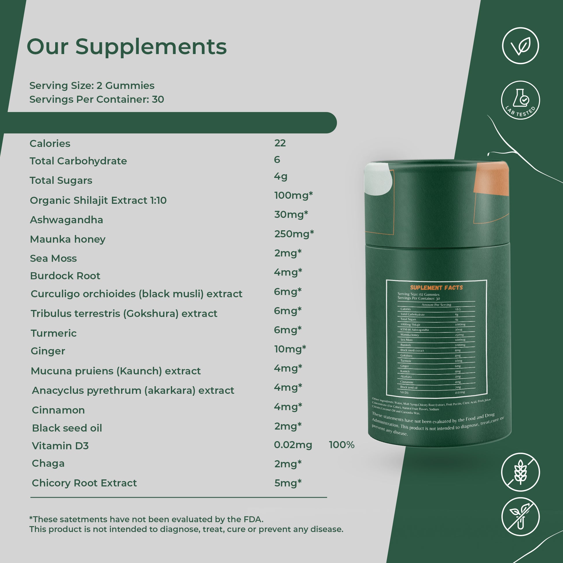 - Packed with Himalayan Shilajit and energizing Ashwagandha, these powerhouse gummies help fight fatigue, boost stamina, and support all-day endurance. Inspired by Ayurvedic tradition, reimagined for your modern lifestyle.